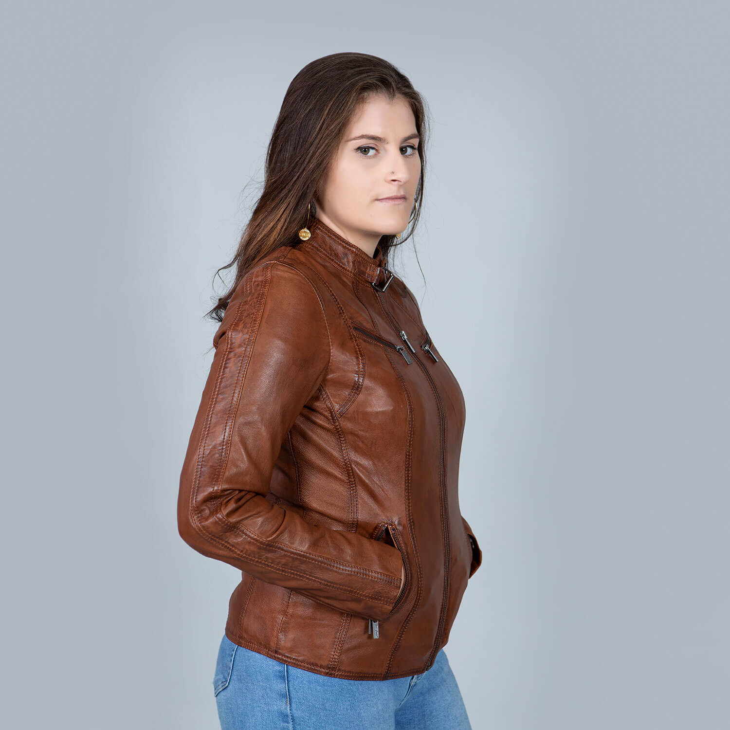 Enhance your look with our Women’s Leather Jacket 9902 in rich Brandy – a classic masterpiece that mixes fashion and functionality. Its center zip and button buckle collar fastening are both functional and fashionable. This jacket flawlessly marries elegance and comfort, with substantial storage, including chest and front zipper pockets, and a comfy 100% cotton inside. It’s a best-seller for a reason, and it comes in a number of attractive colors, allowing you to make a lasting impression.